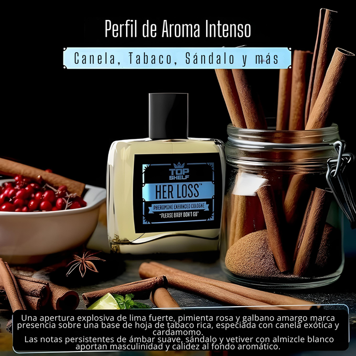 Her Loss es nuestra colonia masculina premium, con feromonas exclusivas, maximiza tu atractivo y confianza, garantizando una presencia irresistible y duradera que destaca en cualquier ocasión social.